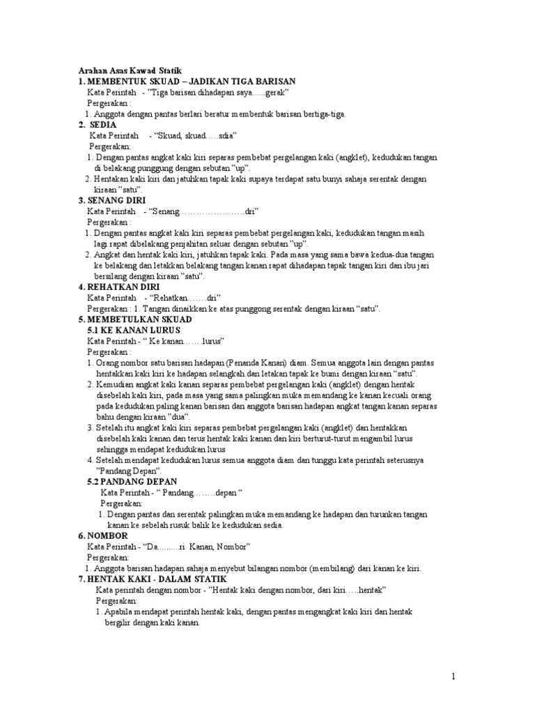 Download buku kawad kaki pdf for free. Bahasa hukuman dan pergerakan kawad : Arahan kawad kaki asas pdf document. Jadual di bawah ini menunjukkan pada kaki manakah patut diberi bahasa perbuatan. Sebagai panduan, jarak masa bahasa amaran diberi dengan kadar empat langkah semasa cepat jalan atau tiga langkah semasa perlahan jalan.